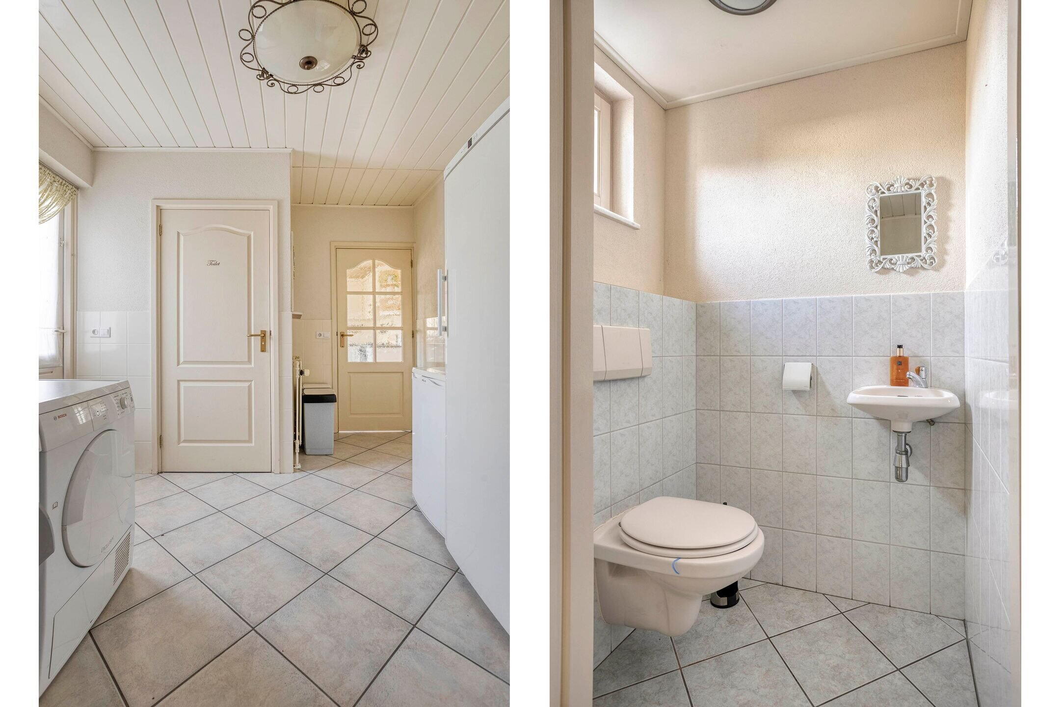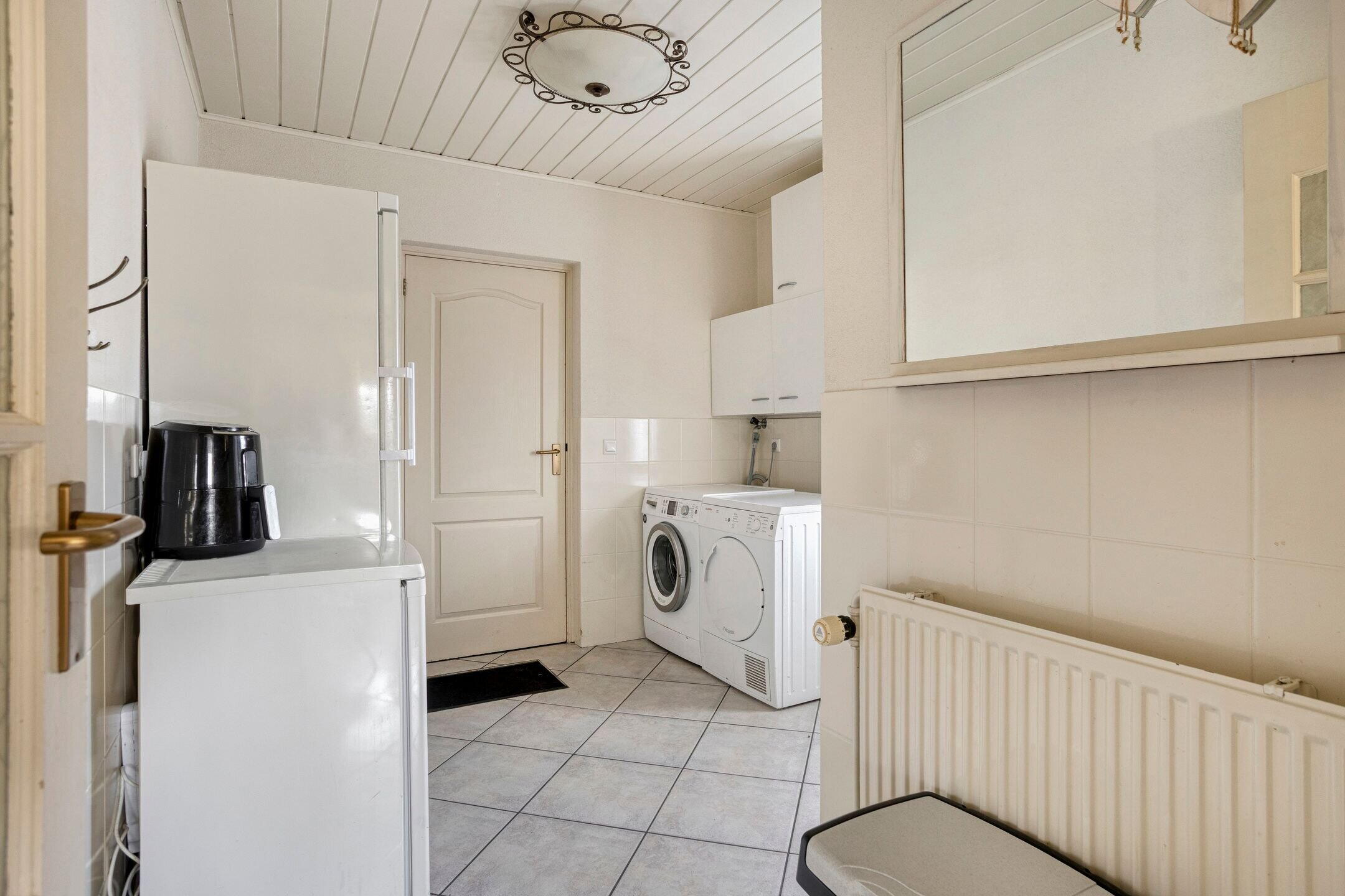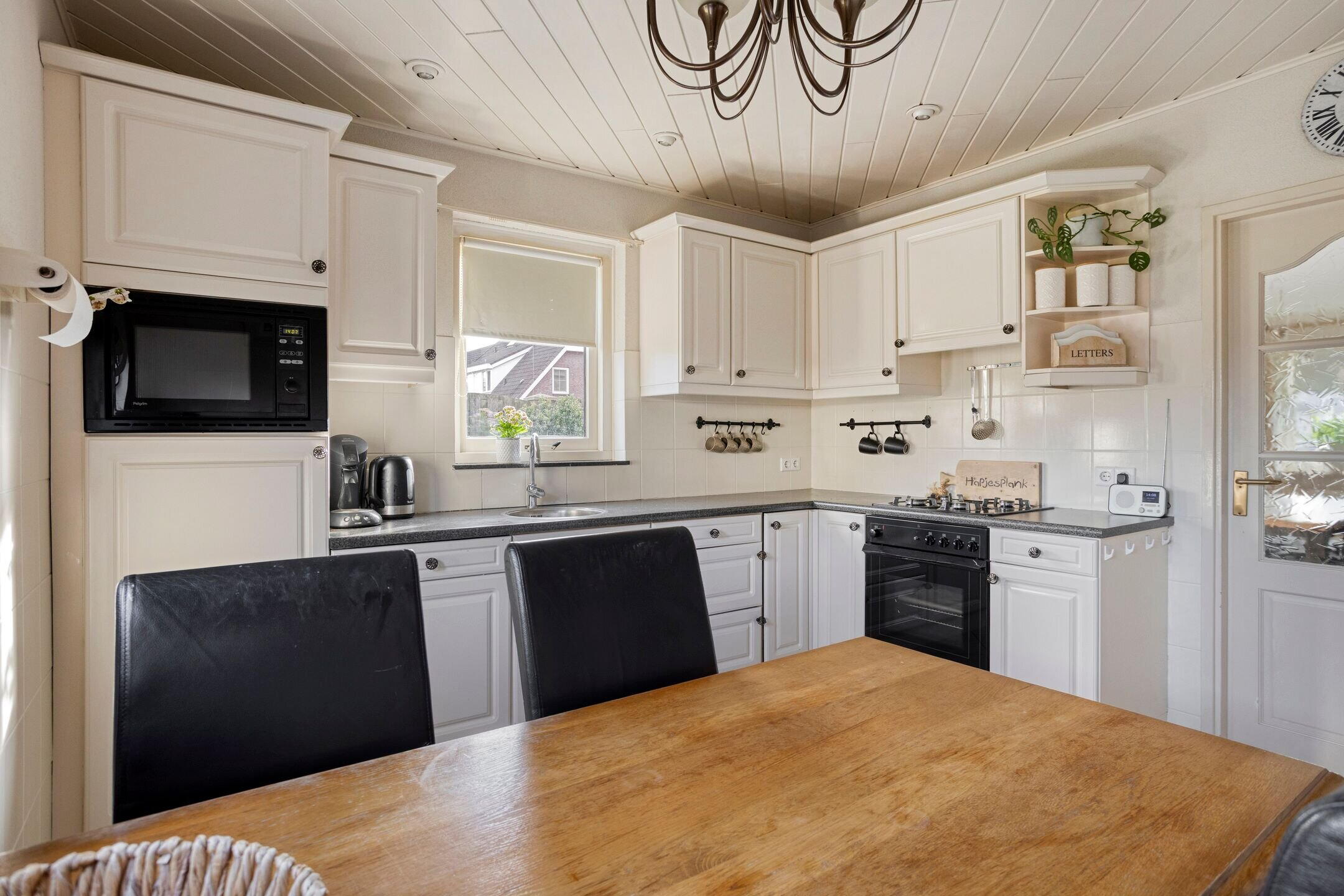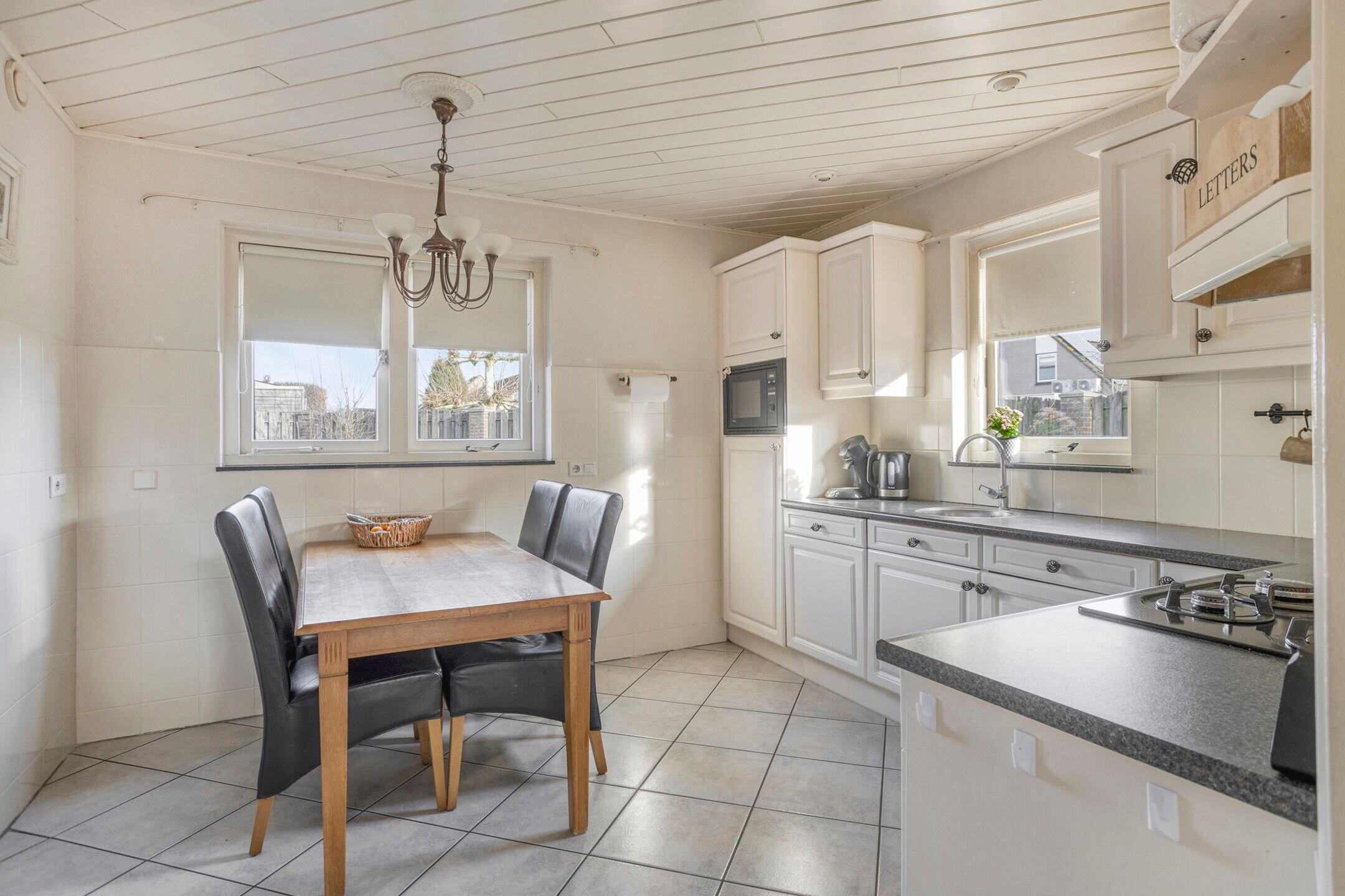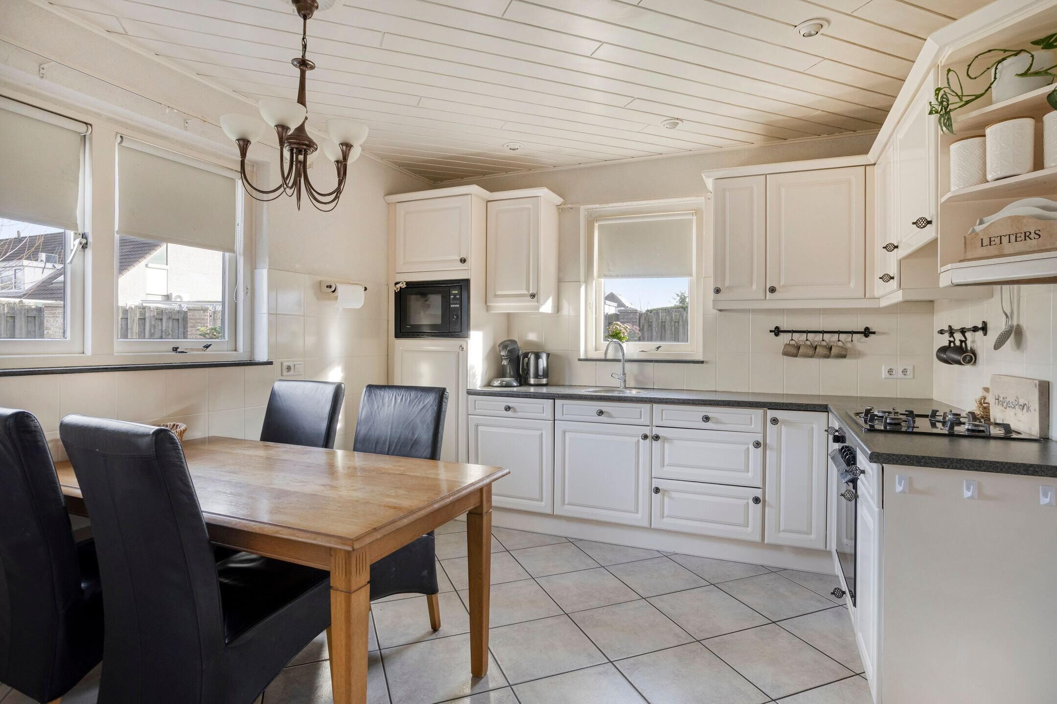 De nette woonkeuken is uitgerust met een 4-pits gasfornuis, magnetron, oven, vaatwasser en koelkast. Aangrenzend bevindt zich de ruime bijkeuken met wasmachineaansluiting, wasbak en een toilet met fontein. Vanuit hier is er toegang tot de aangebouwde garage, waar ook de cv-installatie is geplaatst.